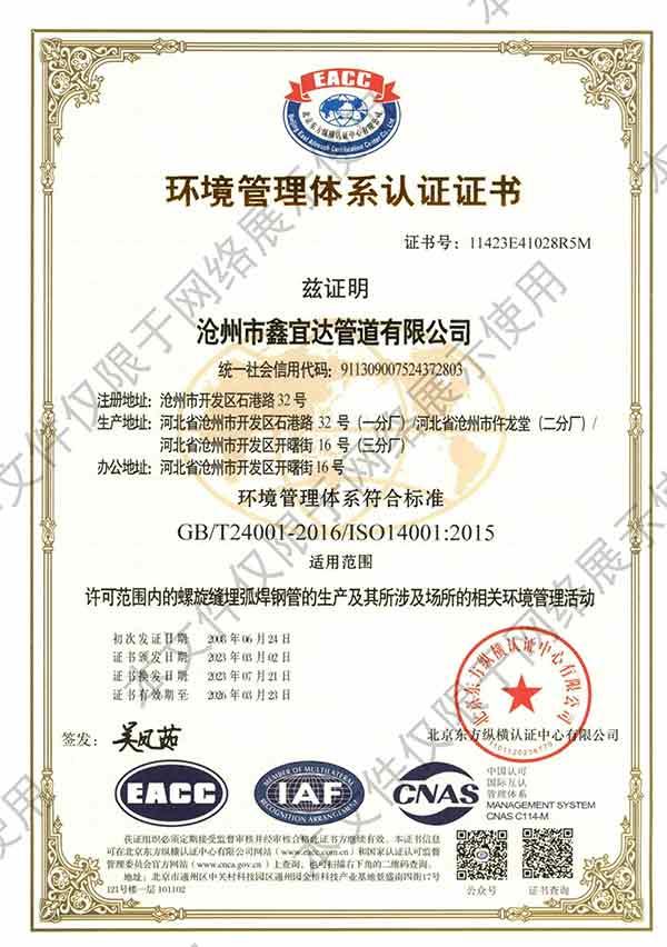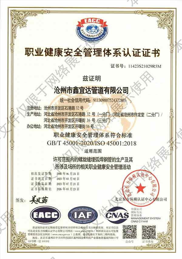 滄州市鑫宜達管道有限公司成立于2003年7月,坐落于滄州經(jīng)濟開發(fā)區(qū),占地面積40萬平方米,注冊資金1.81億元,是集螺旋鋼管生產(chǎn)、防腐加工以及無縫鋼管、卷板、帶鋼等品類鋼材經(jīng)營銷售于一體的工貿(mào)型企業(yè)。公司現(xiàn)有員工400多人,其中,中高級技術(shù)職稱的人員達120余名。 滄州市鑫宜達管道有限公司擁有9條螺旋鋼管生產(chǎn)線和3PE防腐生產(chǎn)線,可生產(chǎn)直徑219--3640mm,壁厚5.5--28mm,最高鋼級X100的各種規(guī)格防腐螺旋鋼管...
